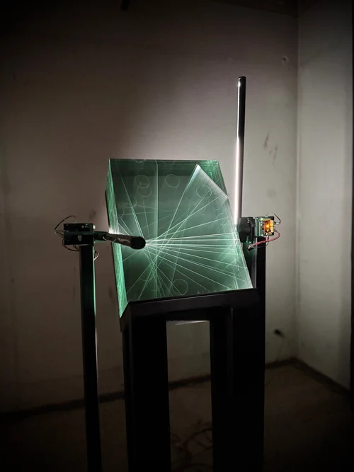 Nicole Khadivi (b. 1998) draws on her background in film to explore time as both spiral and fragment. In her work, cinematic duration is translated into physical space, where light, glass, and movement unfold as slowed sequences. Her installations become acts of developing, of memory, image, and place, while opening philosophical questions of identity, perception, and belonging.