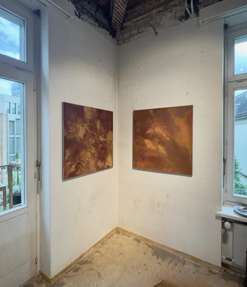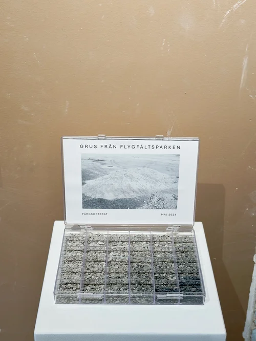 Olle Helin (b. 1993) has worked with pigments sourced from Falun copper mine. The mine, in operation for nearly a thousand years, produced two-thirds of the world’s copper in the 17th century, and is the birthplace of Sweden’s famous Faluröd paint. Using found pigments, minerals, and fragments from his surroundings, he creates subtle chromatic studies that trace connections between place, memory, and material.